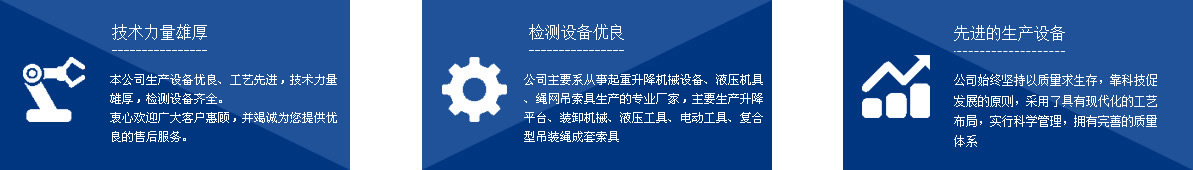 本公司系從事起重升降機械設備、液壓機具、繩網(wǎng)吊索具生產(chǎn)的專業(yè)廠家,主要生產(chǎn)千斤頂、液壓拉馬、軸承加熱器、升降平臺、裝卸機械、液壓工具、電動工具、復合型吊裝繩成套索具、高強纖維柔性吊裝帶、起重鏈條成套索具、橫梁吊具、注塑繩、軟梯、安全帶、安全網(wǎng)等幾大系列、上百種規(guī)格的產(chǎn)品,廣泛應用于電力、油田、大型鋼廠、機電、化工、航空、冶金、機械、鐵道、造紙、港口、建筑等領(lǐng)域。